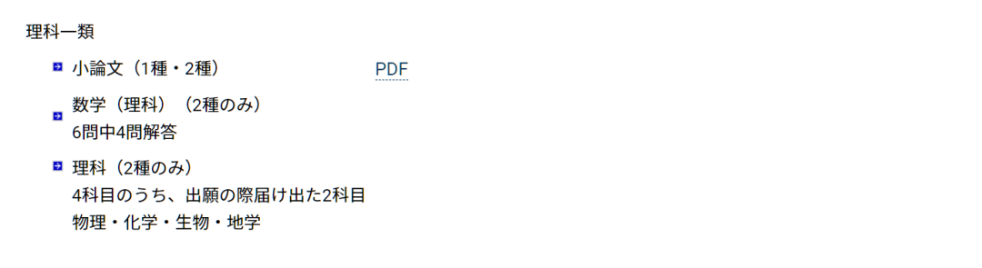 文科是日语、综合科目(包括地理、历史、社会、政治等文科综合)、数学3个科目。理科是日语、理科(从物理、化学、生物中自由选择2科)、数学3个科目。