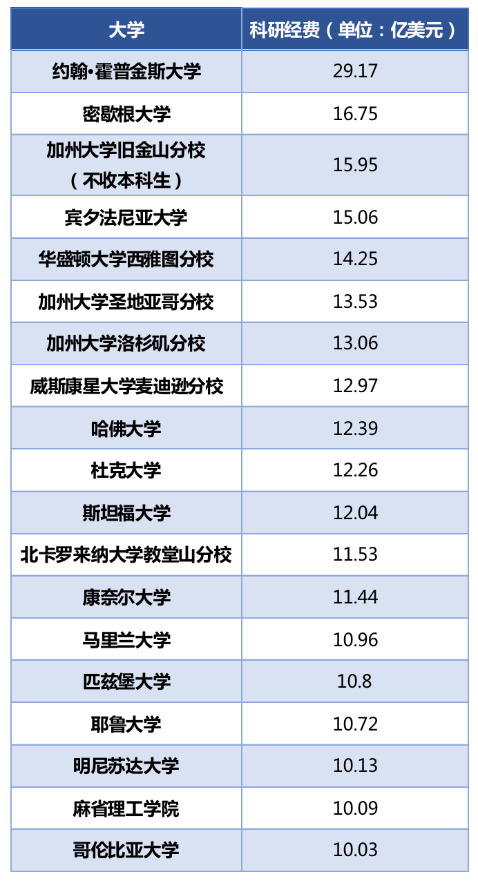 以2019财年在科研上花费超过10亿美元的19所大学: