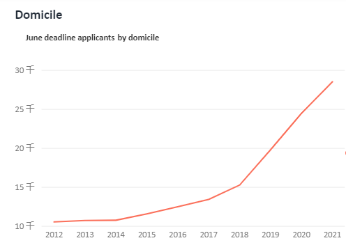 除了欧盟申请量因为英国脱欧而大幅下降外,英国本土和其他主要生源国的申请量均明显上升。虽然疫情仍旧存在,但全球的高中毕业生似乎没有为此继续困扰,申请人数创造了新纪录~