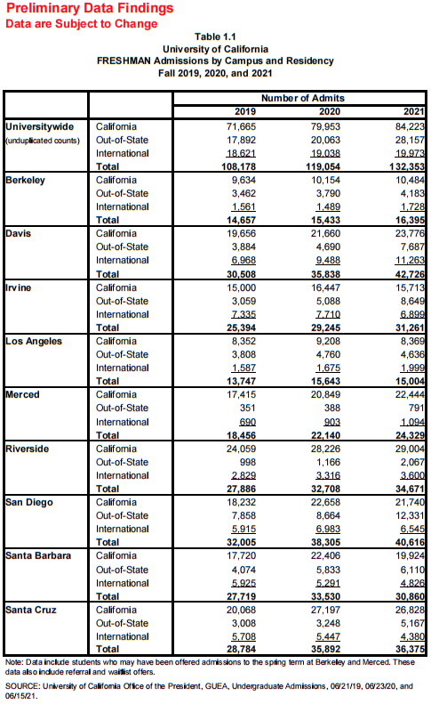 近日,加州大学系统公布了2021年秋季入学的申请数据,因为加州系最近两年调整了一些招生政策,申请和录取人数都有一个明显的变化。