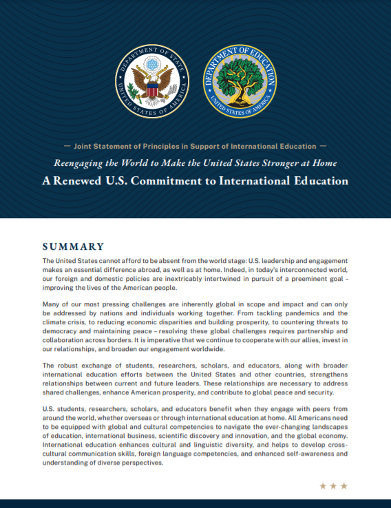 7月26日,美国国务院和教育部发布联合声明——《美国对国际教育的新承诺》(A Renewe U.S. Commitment to International Eucation)宣布将大力促进美国成为国际学生的目的地,并助力于全球学术交流。