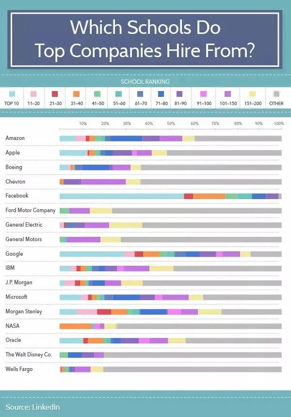 LinkeIn把各大行业巨头的员工学校背景查了个底,发现他们有惊人的共性:都爱名校生!