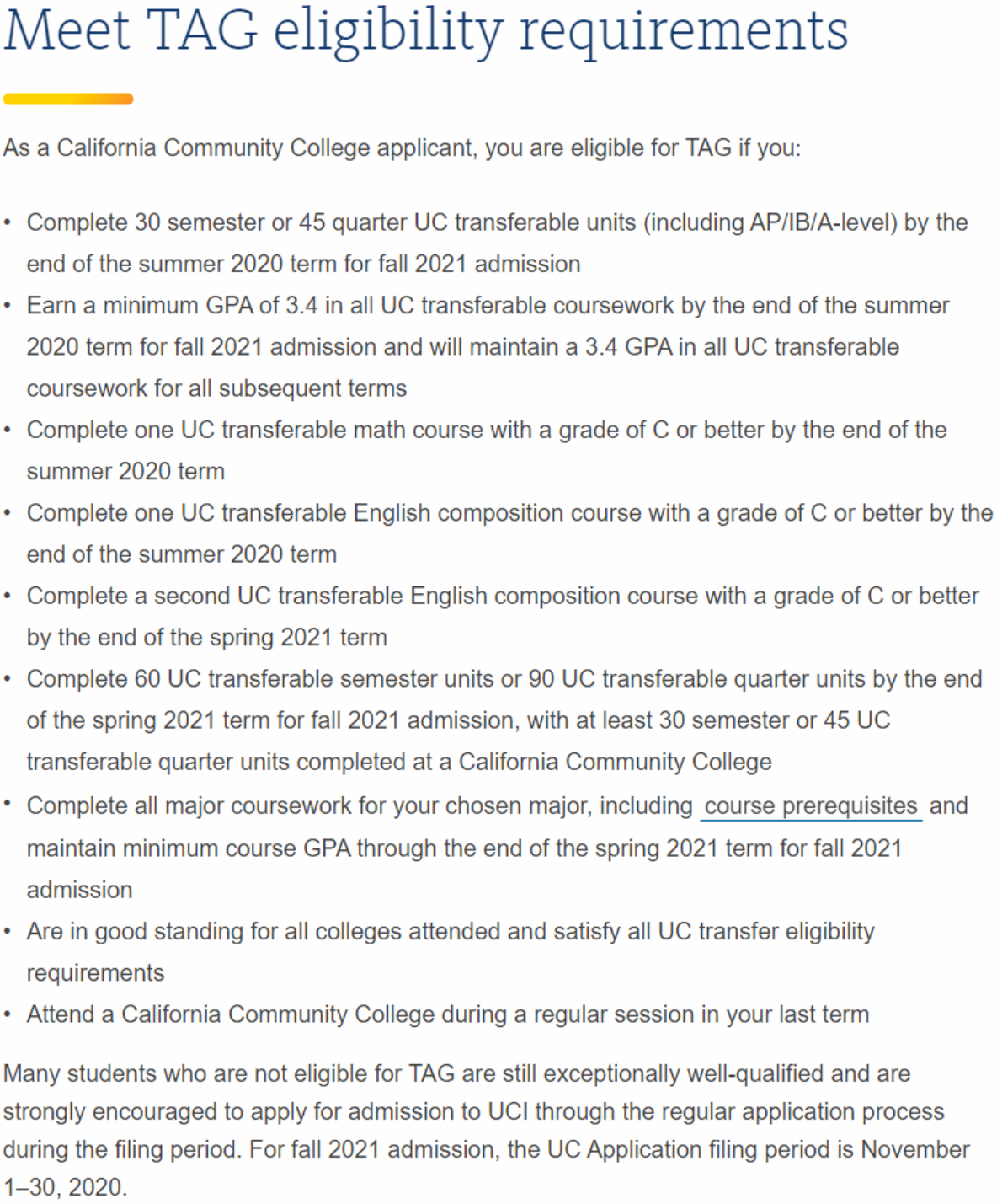 UC TAG项目由六所加州大学分校联合提出,旨在为加州社区学院的学生提供保证入学资格。 必须符合学校的特定要求,才可以和对应学校签订TAG。