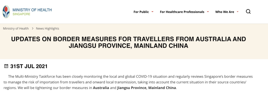 新加坡卫生部官网7月31日消息,新加坡当局再次收紧对2个地方的边境措施。