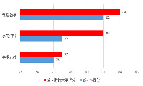 在这次满意度调查中,除了总分名列前茅以外,兰卡斯特大学在课程教学、学习机会、学习资源和学习社区、组织与管理、以及学术支持等方面的排名均处于全英高校的前25%。