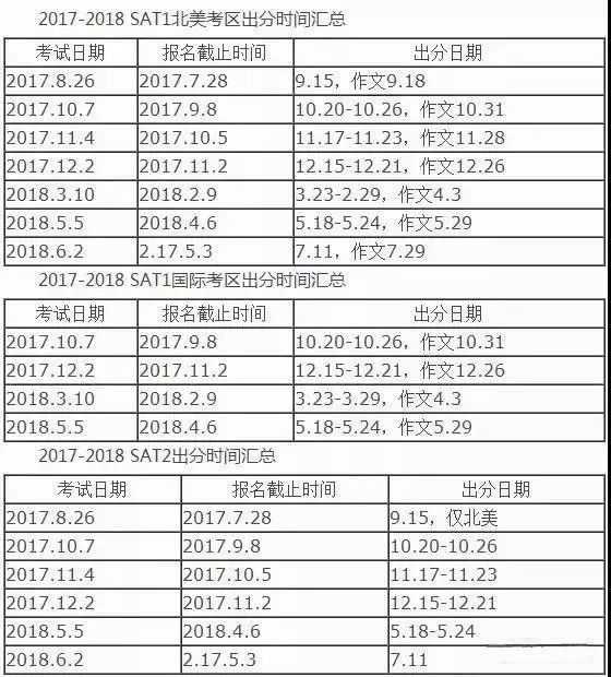 1 、 2017 年 10 月、 11 月、 12 月, 2018 年 3 月、 5 月的 SAT 考试,阅读 (Evience-Base Reaing an Writing) 和数学 (Math) 部分将于考试日之后的两周内出成绩,并且, CB 将在你收到这个分数的 10 天内将成绩递送给大学。