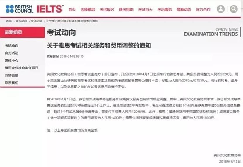 凡报名 2018 年 4 月 1 日之后举行的雅思考试,其 报名费调整为人民币 2020 元 。雅思(普通类及用于英国签证及移民类) 成绩复议服务 (含一项或多项复议)的 费用调整为人民币 1400 元。