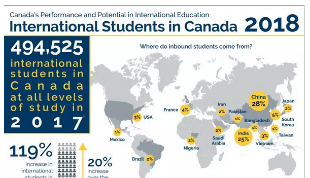 再看这份 Canaian Bureau for International Eucation 在 2018 年发布的数据。截止至 2017 年,已有 494,525 名来自世界各地的留学生,选择留学加拿大,而在他们之中, 28% 的学生来自中国,人数直逼 14 万人,远超预期目标。
