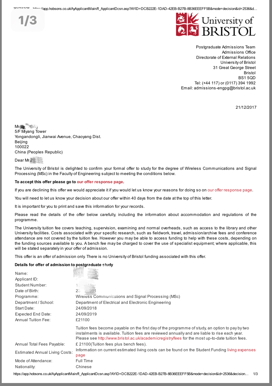 由于准备的时间比较晚,我特意安排了文案加急工作,并且给学生做了一个 CV ,尽量往项目管理和工程相关的工作经验上靠,忽略市场的性质,因为学生申请的都是工程相关,其中曼彻斯特大学是项目工程管理。我和学生说,虽然时间我们较晚,但所有的材料务必齐全且保证质量,做到最好才能把申请递交上去,学生也表示完全配合我的工作,文书一系列都按照我的要求提供素材并且尊重文案老师的意见。经过一个月的准备时间,我们终于把申请递交上去,学生所在的天津大学特别不好开均分证明,所以布里斯托要求学生务必提供均分证明才予以审理,在这博雅老师做个温馨提示,如果学校不能提供均分证明,那就去学院去开,相对能容易很多。另外,布里斯托要求学生的申请必须提供 CV 和一整套学术材料才能予以审理。我们把布里斯托作为首选,因为布里斯托是英国工科非常强的院校,综合排名也很高, Double E 相关专业也是学校的王牌专业,而曼彻斯特我们选择的是项目工程管理,相对专业性没有那么强且中国人比较多,但学生也做了备选,爱丁堡作为冲刺,毕竟爱丁堡是一个特别看重均分的院校, 985 的学生不好拿高均分,相对双非的学生申请,优势不是那么显著。一个月后,学生如愿拿到了布里斯托的 offer 。但是曼彻斯特和爱丁堡由于递交申请时间晚,所以名额有限的情况下,学校拒绝了学生的申请,我们分析的结果是因为,在最后仅有的几个名额中,学校录取了均分更高的学生。但学生内心也是更倾向于布里斯托,毕竟院校和专业对他来说都是最满意的,学生的运气相对也是特别好的,因为有很多 985 院校,均分高于他的同学,也没有拿到布里斯托大学的 offer 。所以学生很开心,也感激我们的团队,一起头脑风暴,最大程度保证了学生的成功录取。