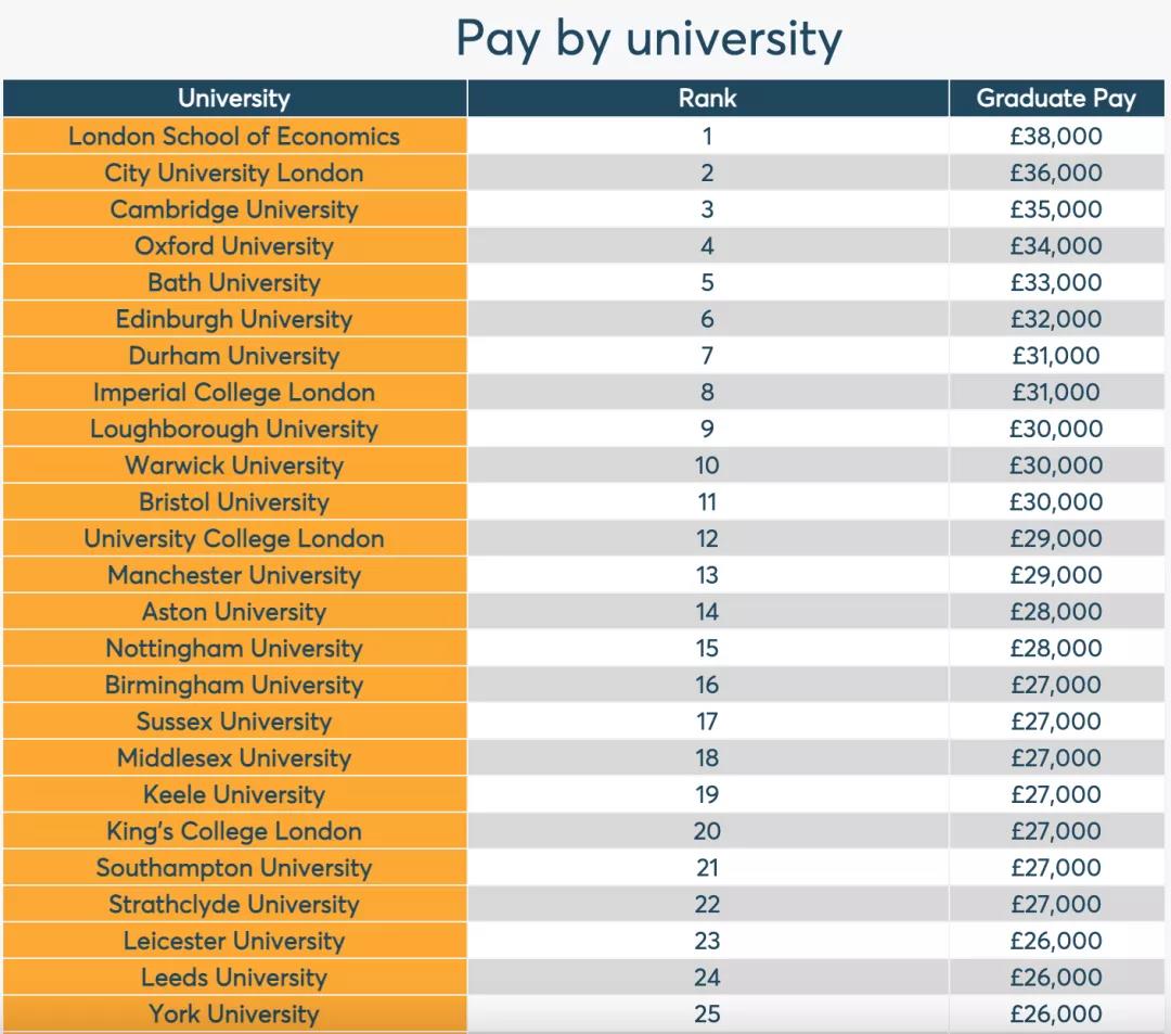 万万没想到,排名第二的伦敦城市大学的毕业生年薪高达36000英镑。要说这所学校,无论是在英国,还是在我们国内,都不算特别好的学校,QS世界排名350位,基本上不是国内学生考虑的学校。 但是这所学校比较厉害的地方是,它有一所欧洲鼎鼎大名的商学院——卡斯商学院,跟英国众多企业合作,学生找工作一点也不输英国的G5名校,只可惜国内的知名度实在差点意思,导致很多学生不敢申请。