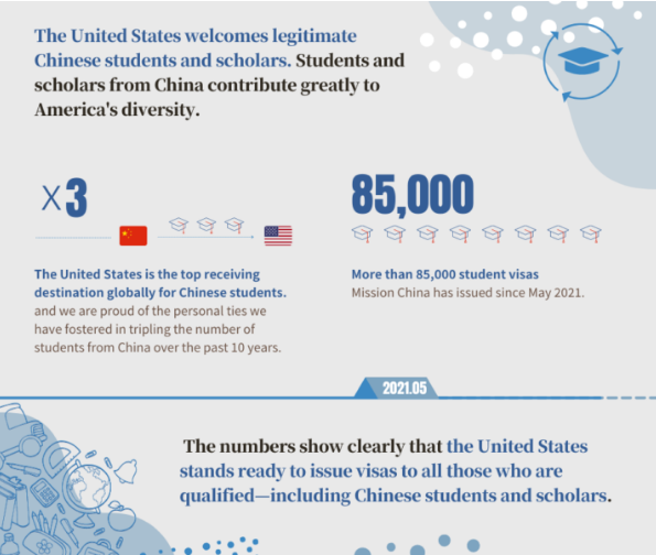 根据美国驻华大使馆最新数据,自2021年5月以来已经签发了超过8.5万张学生签证。这表明中国学生仍渴望赴美留学,中国是美国最大的国际学生来源国,去年在美中国留学生近38万,占到美国所有国际学生的35%,所有国际生为美国“创收”390亿美元。