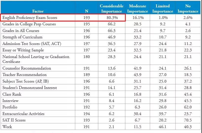 英语水平考试成绩(托福、雅思): 递交反馈的193所美国大学有80.3%认为,对国际生来说,最重要的申请因素是托福/雅思分数。
