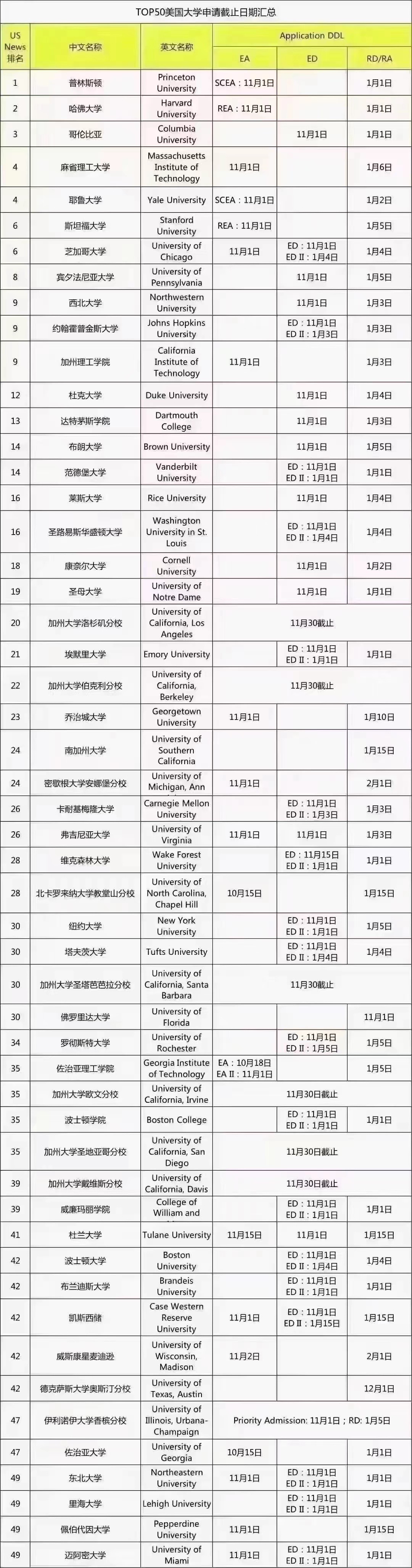 ED策略:ED是互选,录取比例在20%以上,ED1定的学校是我们跳跳的学校,因为还有ED2 ,所以不用太担心。那些学校有ED2呢?以下是前50名大学有ED2的名单及ED2截止日期,好好利用喔!
