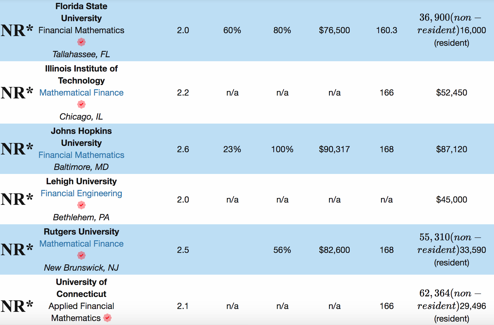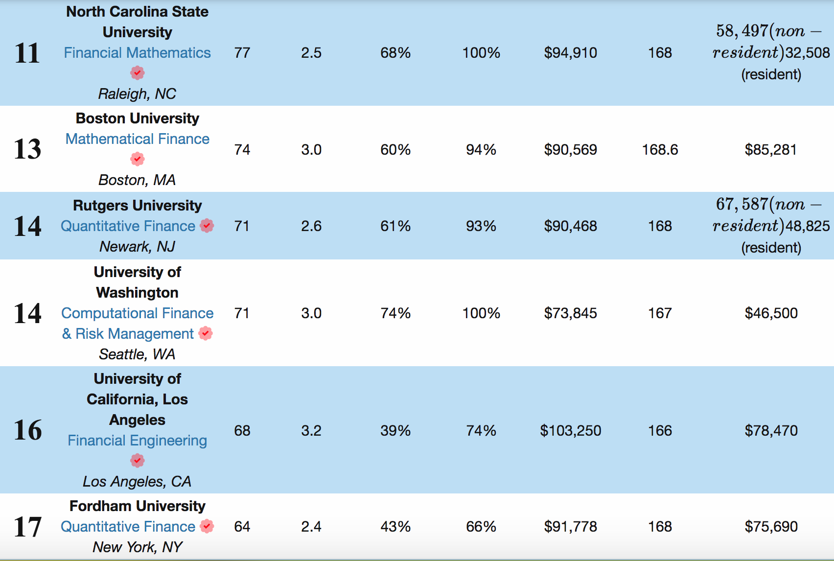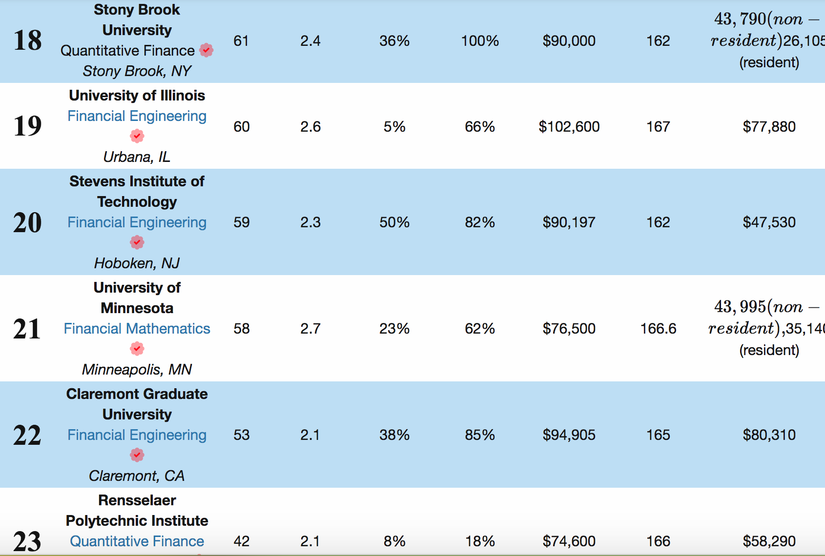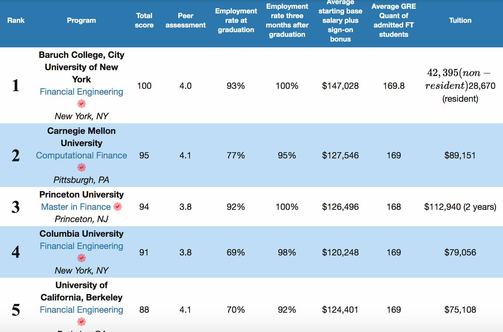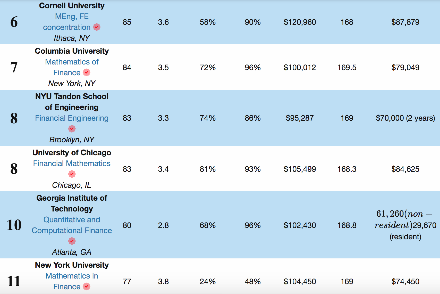 申请金融工程硕士或者金融数学硕士想要看专业排名怎么看?大部分学校和学生会参考两个比价权威的排名, TFE Times 和 QuantNet ,这两个排名有什么区别呢? TFE Times 更看重院校的整体名气( Reputation );而 QuantNet 更实在一些,排名标准更多地依据学生的就业情况( Employment ),今天给大家分享 2021年 QuantNet 排名: