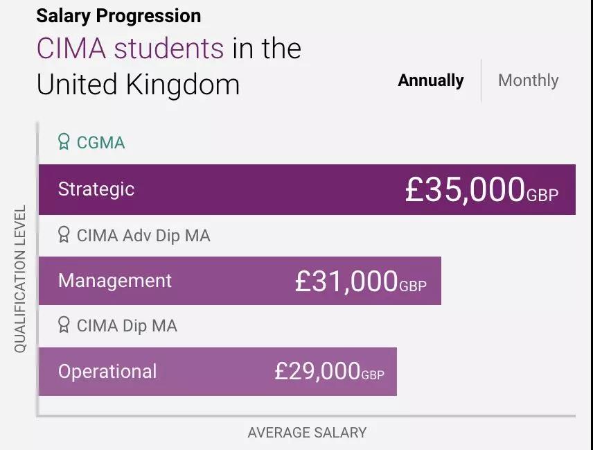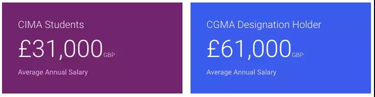 而 CIMA对于其不同阶段会员的薪资也有统计。下图一说的是: CIMA协会所有阶段学员人均年薪大致在£31,000,而获得CGMA(全球特许管理会计师)之后人均年薪在£61,000, 翻了将近一倍。