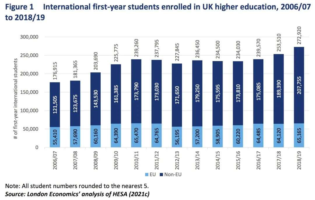 英国留学生的分布情况的这份报告显示,2018/19学年,共272920名大一国际新生在英国开始学习,人数自2006/07学年以来增加了54%。其中,76%是非欧盟学生,24%是欧盟学生。
