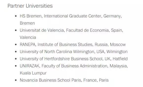 **IGC开设的International MBA是由International Business School Alliance (IBSA)国际商学院提供的 IBSA双学位硕士 课程,也就是说学生在一年后可以获得两所学校的MBA学位→_→Bremen和合作院校中的一所。 **