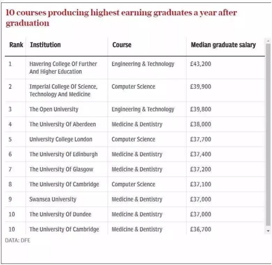 开放大学( Open University )的工程技术在这份榜单上也表现十分抢眼,毕业一年后平均收入 £39,800 ,排在第三位。