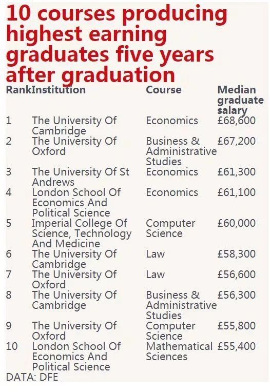 而剑桥大学经济专业稳坐第一,平均收入高达 £68,600 。