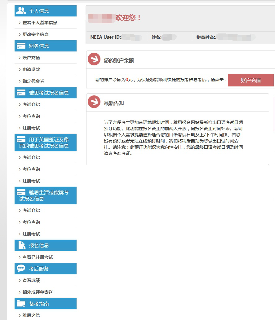 如果你从未使用过教育部考试中心 IELTS考试网上报名系统,你必须先注册成为用户。完成这一步,你需要提供基本的个人资料如:姓名、身份证明号码、邮寄地址、电话号码和电子信箱地址。当你提交了所需要的资料之后,你将得到教育部考试中心报名系统分配给你的一个NEEA用户号(NEEAuser ID) 号码。