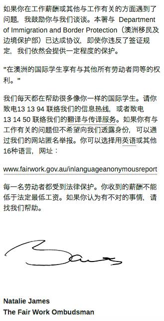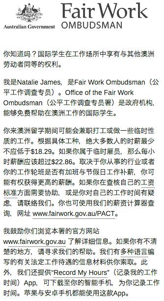 从2018年7月起, 澳洲政府机构Fair Work Ombusman已将澳洲最低时薪从 $ 18.29澳元提升至 $18.93澳元 。去年九月份, Fair Work Ombusman 曾发表了致国际学生的公开信, 强调国际学生在澳打工时与澳洲本地员工享有同等的权益,如遇到不公平待遇,需及时举报 。