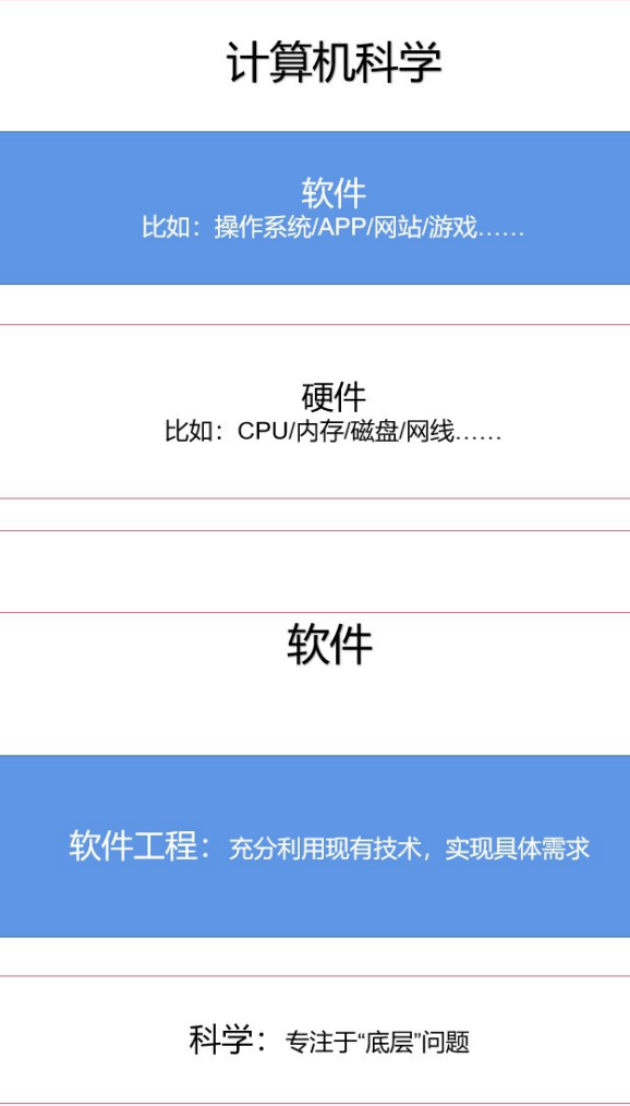 计算机科学(Computer Science)和软件⼯程(Software Engineering) “计算机科学是从数学理论和计算理论中寻找解决复杂问题的⽅法。软件⼯程则专注于设计并开发出美观且好⽤的软件。”