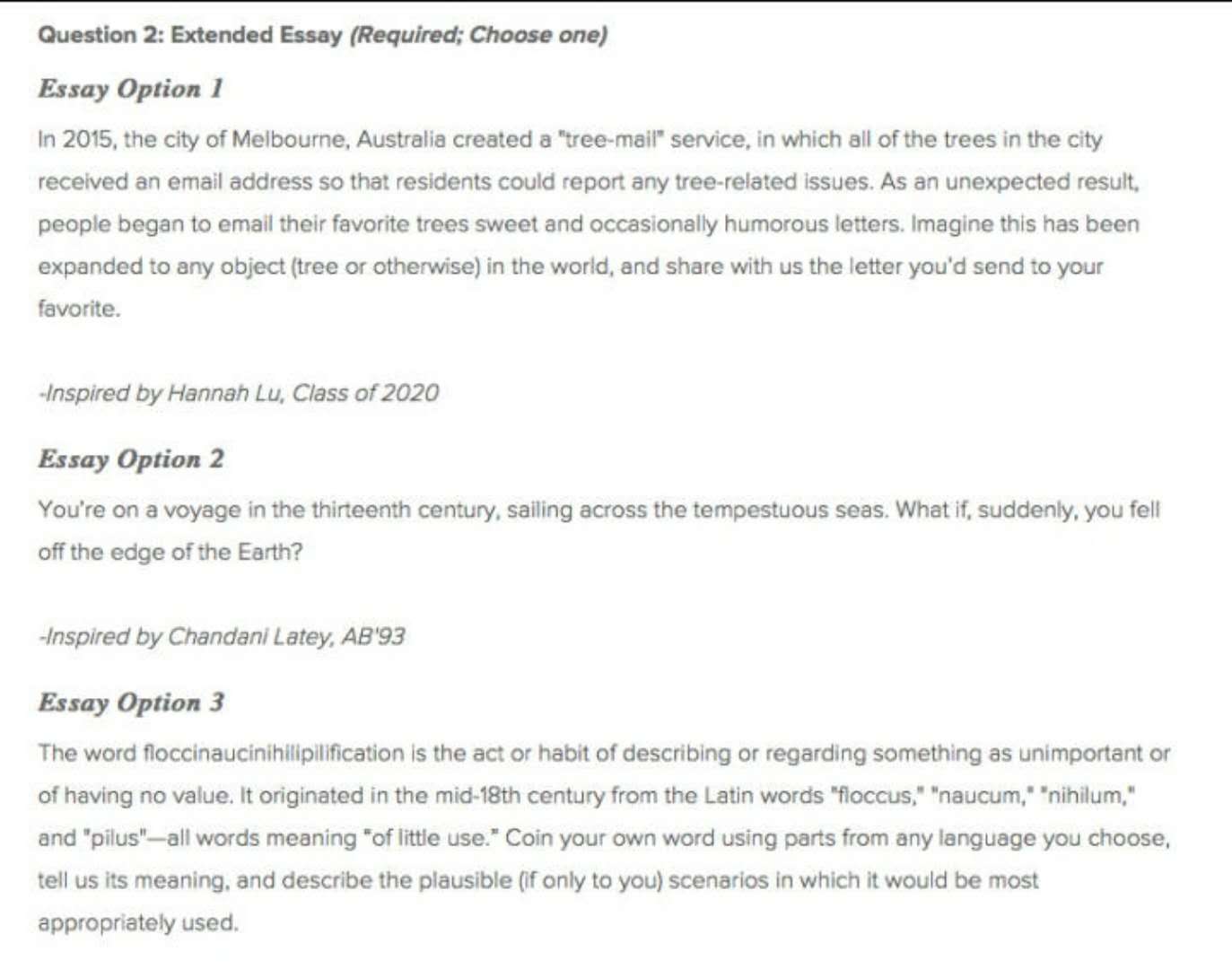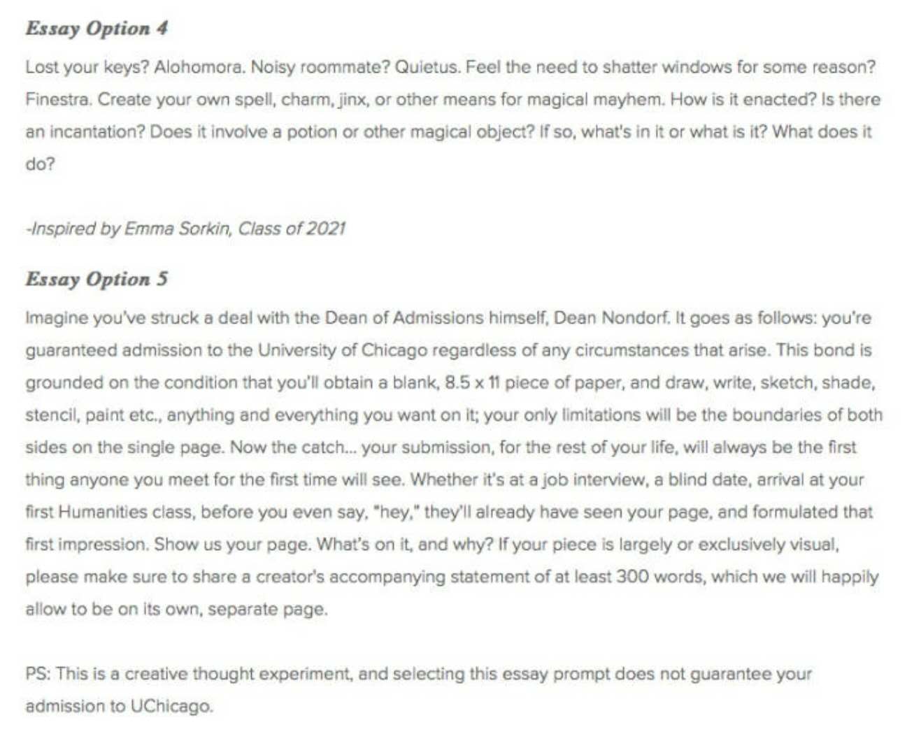 芝加哥大学今年的文书题目有两个,第一篇比较常规,why school问题。第二篇是6选1,这些问题从每年录取的新生中收集而来。讲真,有些问题蛮奇葩的,不容易写