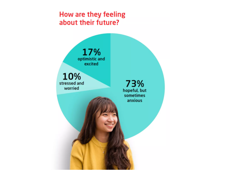 在疫情的影响下,我们可能会猜测这些学生会对自己的未来更担心,但其实不然,这届留学生展现了非常强劲的恢复能力,其中有17%的学生对未来感到乐观与兴奋,73%的学生对未来充满期望,同时也有一丝紧张,而仅有10%的学生对未来感到压力较大,比较担心。