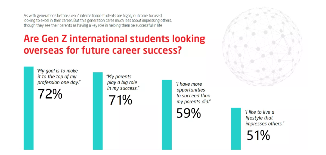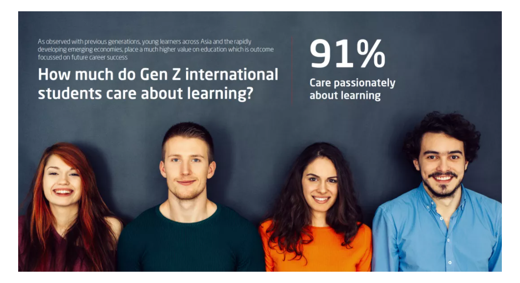 同时正如之前的届国际学生一样,这些Z世代留学生们,特别是来自亚洲和其他新崛起的发展中区域的学生,对于教育质量以及成果(职场发展前景)非常看重。91%的受访学生都表示自己对于学习有着很高的热情。