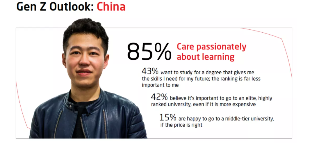 在职场发展方面,虽然与之前世代的学生同样以结果为导向,并期待在职场取得成就,但他们不再过多的关注其他人对自己的印象,而更关注自己的感受,同时也认可父母在能帮助自己取得成功中将会扮演的角色与作用。