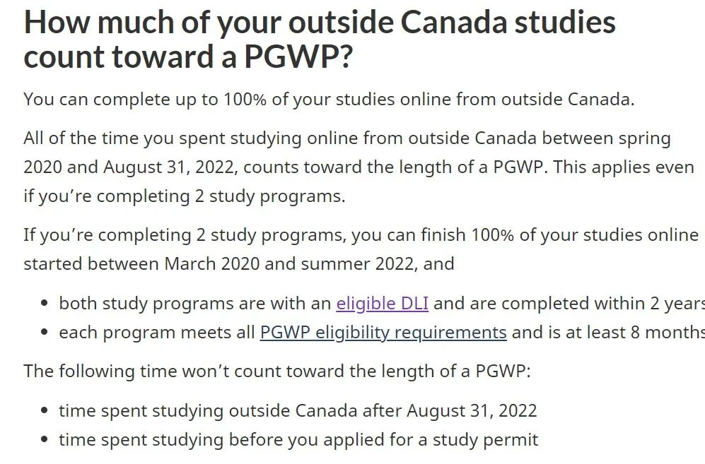 您在2020年春季至2022年8月31日 (之前是截止在2021年12月)期间在加拿大境外在线学习的所有时间在加拿大境外在线学习的所有时间都计入PGWP的时长。(即使您正在攻读两个学习课程,这也适用!)