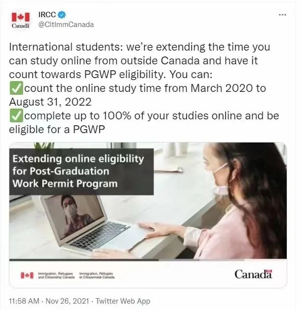 根据加拿大移民局11月26日更新,您最多可以在加拿大境外完成100%的在线学习。