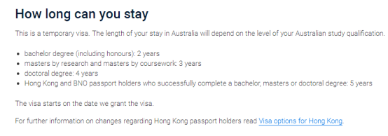 Post-Stuy Work stream适用于2011年11月5号之后首次申请澳洲学生签证并顺利完成课程获得学位的毕业生。学生在澳洲获得的学位等级决定签证的长度,一般为2-4年。2021年12月1日授课型硕士签证长度由之前2年调整为3年。