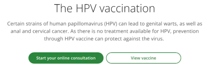 https://onlineoctor.lloyspharmacy.com/uk/hpv-vaccine 进入该网页点击Start your online consultation,按照提示完成线上小问卷及其他步骤,提交订单。Pharmacy的医生在确认你的情况可以接种后会邮件告知你,之后同学们就可以给选择的店打电话预约接种了。