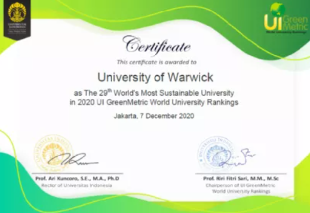 华威大学在生态环境保护、绿色可持续发展方面的成绩有目共睹。在2020年国际绿能世界大学排名(UI GreenMetric Worl University Rankings)*中获得全球前三十、全英前五的好成绩。
