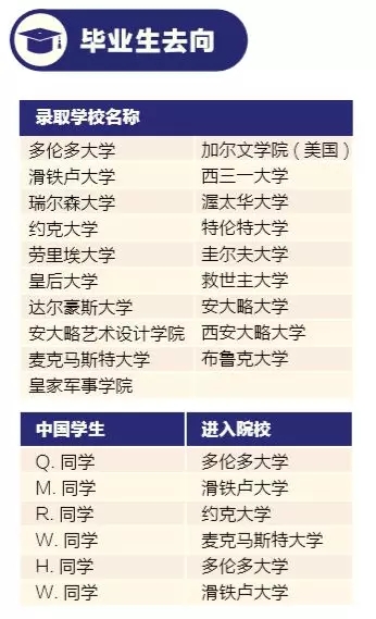 学校提供 一对一的升学辅导 。从毕业去向来看,往届中国学生去向很令人满意: