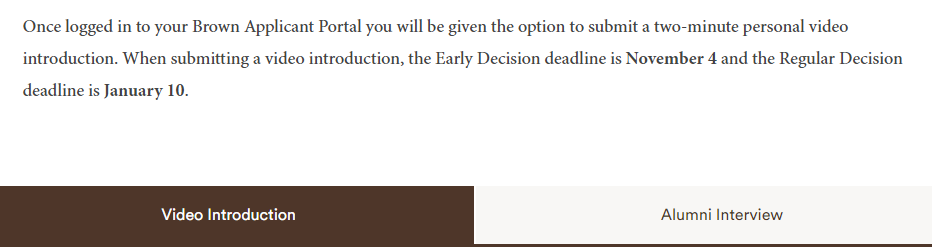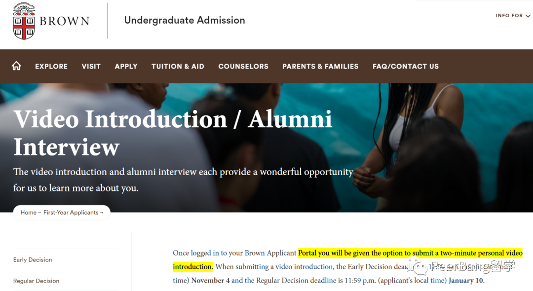 布朗大学:申请人登入 Portal 后可选递交2分钟的自我介绍视频,话题不限,点击Portal里链接上传文件。截止时间11月4日(ED)或1月10日(RD)。