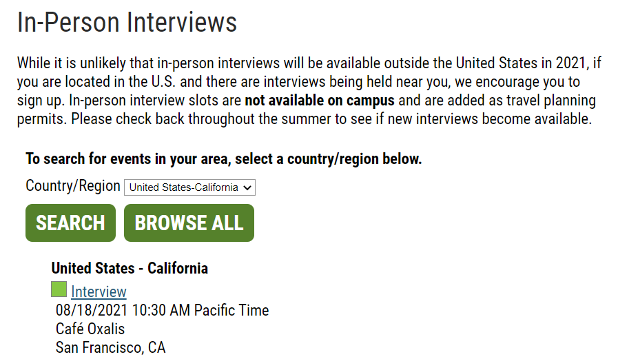 线下面试也可能是校外面试(Off Campus Events),今年因为疫情原因,国外的线下面试不太可能,仅有几所大学提供美国境内一些城市的线下面试,比如今年罗彻斯特大学在美国加州、双子城、芝加哥等地有线下面试机会,杜兰大学在美国加州和俄勒冈州有少量线下面试,一旦因疫情情况有变,这些面试也会转为线上。
