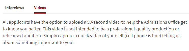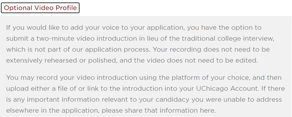芝加哥大学:申请人可选递交2分钟的自我介绍视频。内容不限,不需要特意进行剪辑,以文件或链接的形式在芝加哥大学账户里附上。