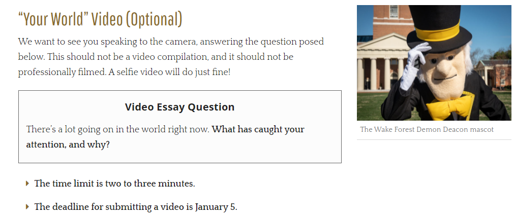 维克森林大学:申请人在登入portal后可选递交3分钟以内的“你的世界”视频。回答“世界纷纷扰扰,什么吸引了你的注意力?为什么?”指定问题,截止时间为1月5日。