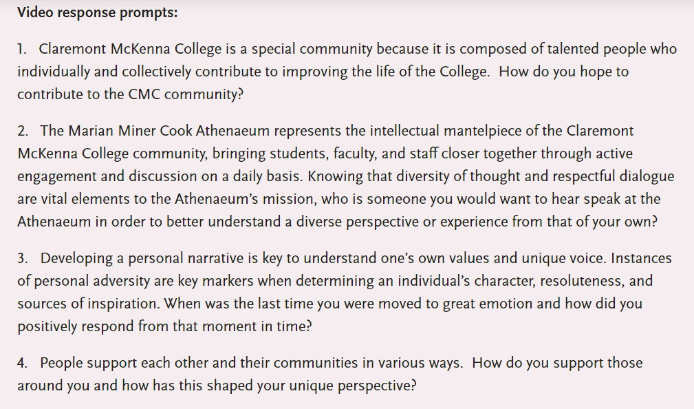 克莱蒙特麦肯纳学院:申请递交后会收到招生办提交2分钟视频的具体指导,申请人可选提交,需回答指定的题目。