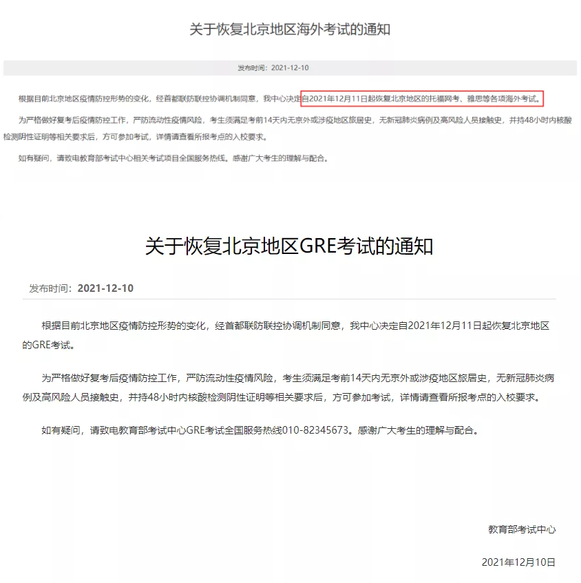 12月10日,教育部考试中心发布消息:自2021年12月11日起恢复北京地区的托福网考、雅思、GRE等各项海外考试。考试将正常进行,请同学们尽早预约考位,为考试做准备。
