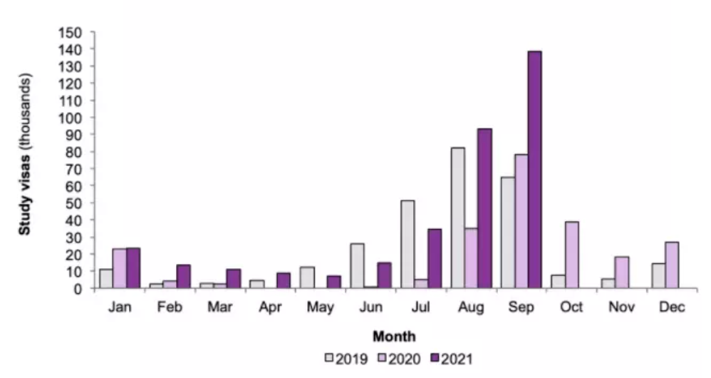 通过过去三年学生签证发放数量柱状图可以看出,2020年受到疫情影响最大,很多留学生的入学时间延迟了数月甚至半年,导致“下签”高峰从传统的7月8月9月,延迟到10月-12月。而2021年9月的下签数量已经远远超过疫情前。