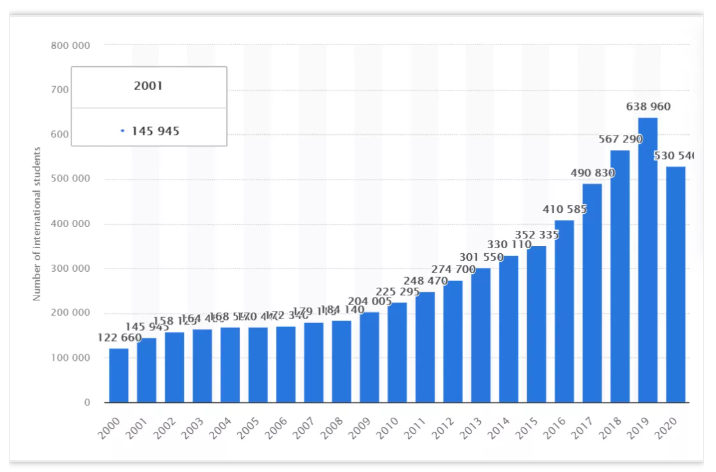 从2000年到2020年,每年在加拿大留学的人数从最初的122,660人增长到了530,540人。其中,2020年的中国留学生有116,935名,超过加拿大所有留学生的五分之一。2019年,共计有638,960名国际学生在加拿大留学,是历年来的巅峰数字。为什么如此多的留学生选择到加拿大留学,不外乎下面这些原因:
