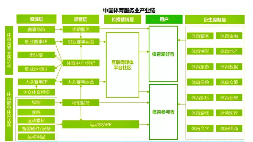 为了便于各位同学了解体育行业,下图梳理了中国体育服务业产业链,在这里也可以看出高端赛事运营、体育经纪、职业教练员等角色非常重要。