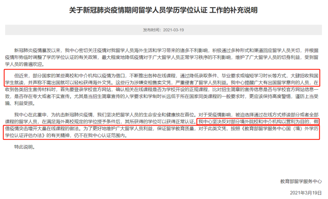 教育部留学服务中心出台了相关政策,对于受疫情影响国内上网课的留学生,在满足海外高校规定的学位授予条件后,只需要提供相关学习材料,所获得的学位可以获得正常的认证。