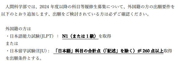 必须拥有 JLPT N1 证书/日本语成绩 260分以上。