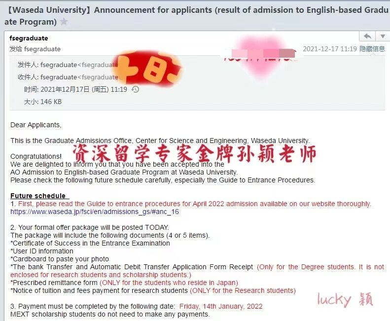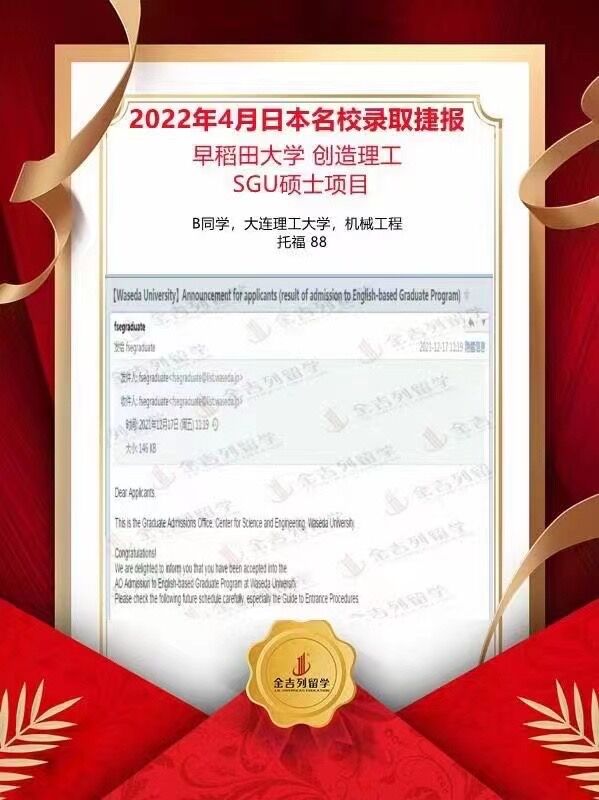 2020年3 月中旬,学生在签约后就分配了学生的名校高端申请文案老师。学生在日本交换过一年,对日本文化很感兴趣,但是对日本研究生的申请不是很积极,需要我们全程跟进,催促和指导下完成。以至于在联系到金吉列的顾问老师时,和他意向申请的院校网申截止时间仅剩1个多月。 而更头疼的是,虽然学生英文完全没问题,但没有雅思或托福成绩。而他意向申请的早稻田大学,明确规定要提交英语成绩。当时由于疫情比较严重,国内的雅思和托福考点都取消了。第一时间让学生抓紧时间想办法报考别的城市,学生行动力还是很快的,报考了石家庄的考试,并顺利考取了托福88分的成绩。金吉列的文案老师为了让学生能稳住心态准备早稻的面试,每天利用学生空余时间给学生做模拟面试,让人欣慰的是,学生在面试时被问到的问题都是文案老师在模拟面试时问过的问题,学生答得非常好,教授也对他很满意。12 月 17日就拿到了正式录取 ~