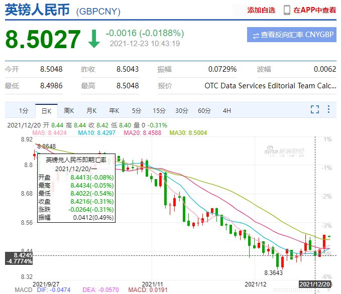 最近几周,英镑兑各大主流货币全线下跌: 自 12月8日英镑汇率近20个月首次跌破8.41以来,英镑汇率波动下跌。