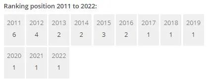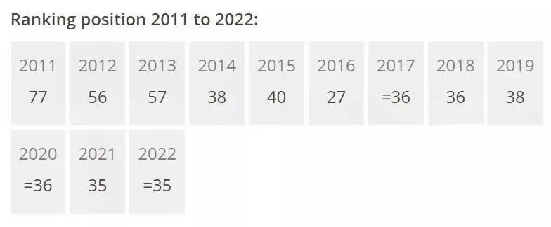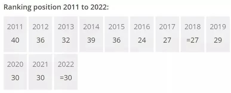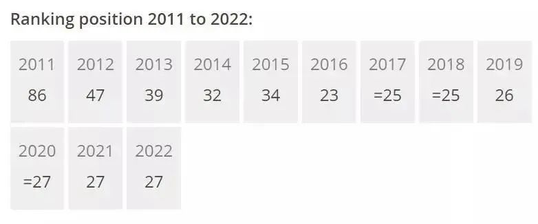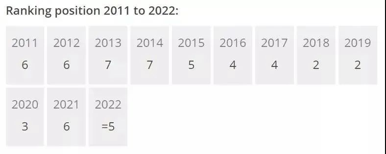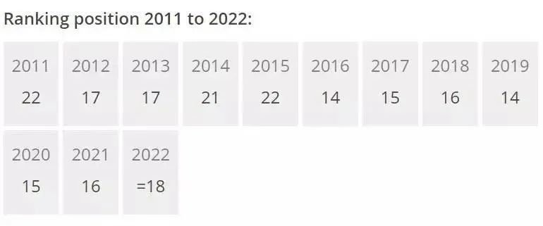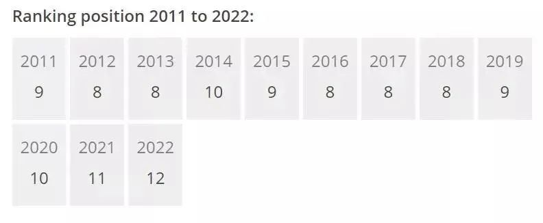 2011-2022 THE综合排名: 稳定且优秀,大部分排在8-9名。